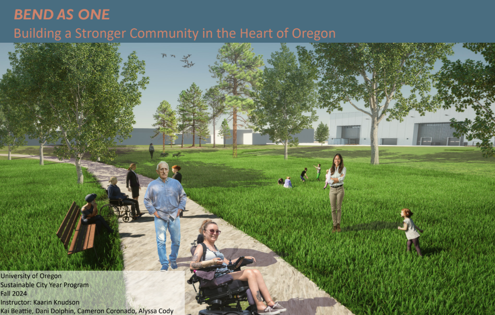 Co-authored the final design proposal for the City of Bend, compiling research and designs from four teams representing equity, transportation, sustainability, and placemaking themes. The proposals offer a vision for a resilient, inclusive, and vibrant space that enhances the quality of life for residents in Bend’s eastside community.